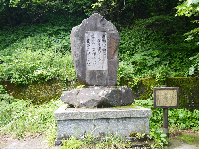 這是野口雨情(1882~1945)所留下個句碑之一,上頭刻有「阿蘇的高森 日日晴朗天氣 田地裡滿是花樣綠菜種子」。在高森嶺一帶有許多句碑或歌碑設置於此。